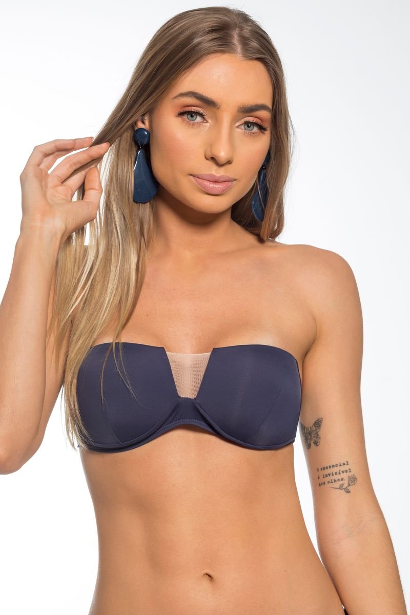 Detalhes do Top Biquíni Tomara que Caia Quadrado c/ Tule Marinho Ebony: